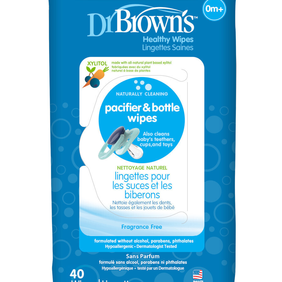Dr. Brown Μαντηλάκια Καθαρισμού Πιπίλας Και Θηλών (40 τεμ.) Υγρά μαντηλάκια καθαρισμού για πιπίλες και θηλές. Είναι εμποτισμένα με ξυλιτόλη φυσικής προέλευσης ώστε να εξασφαλίζουν αποτελεσματικό καθαρισμό καθιστώντας τα ασφαλή για τα μωρά.