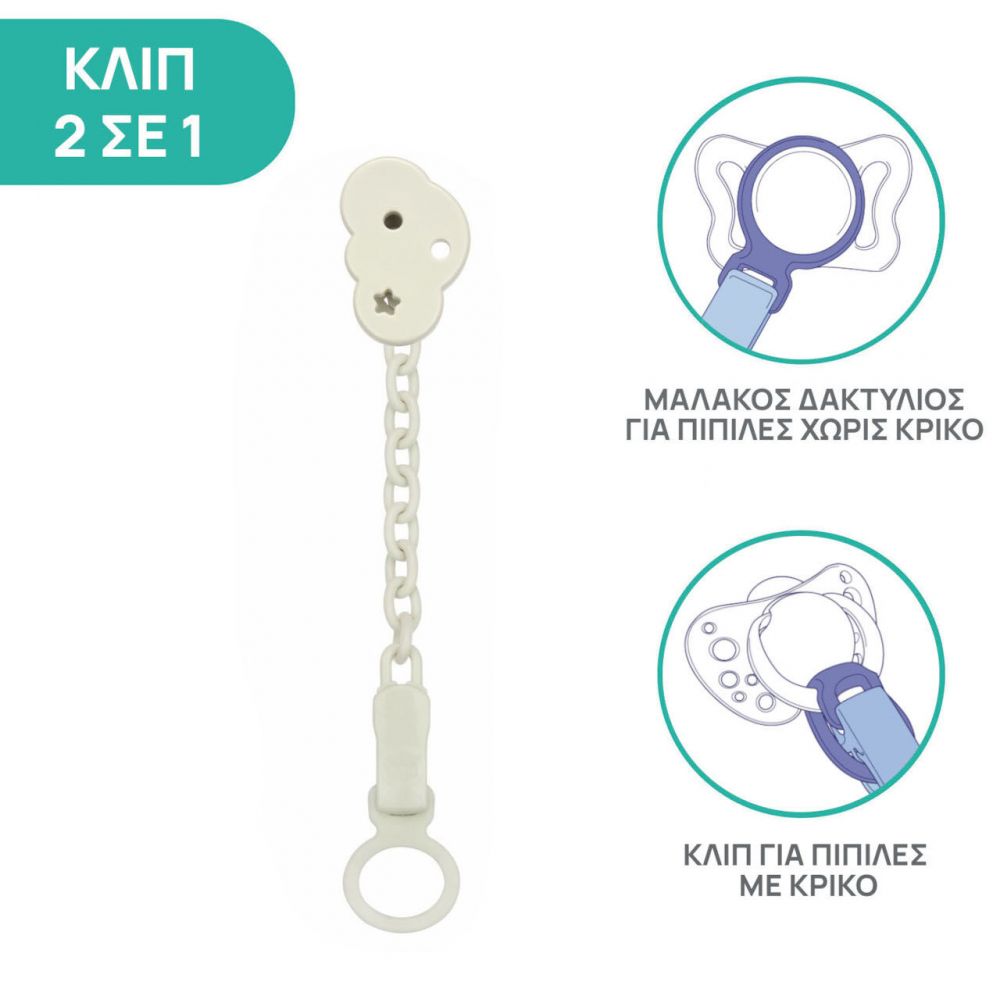 - Διπλή Λειτουργία: Διαθέτει ειδικό μαλακό δακτύλιο για πιπίλες χωρίς κρίκο, αλλά και κλιπ για πιπίλες με κρίκο.