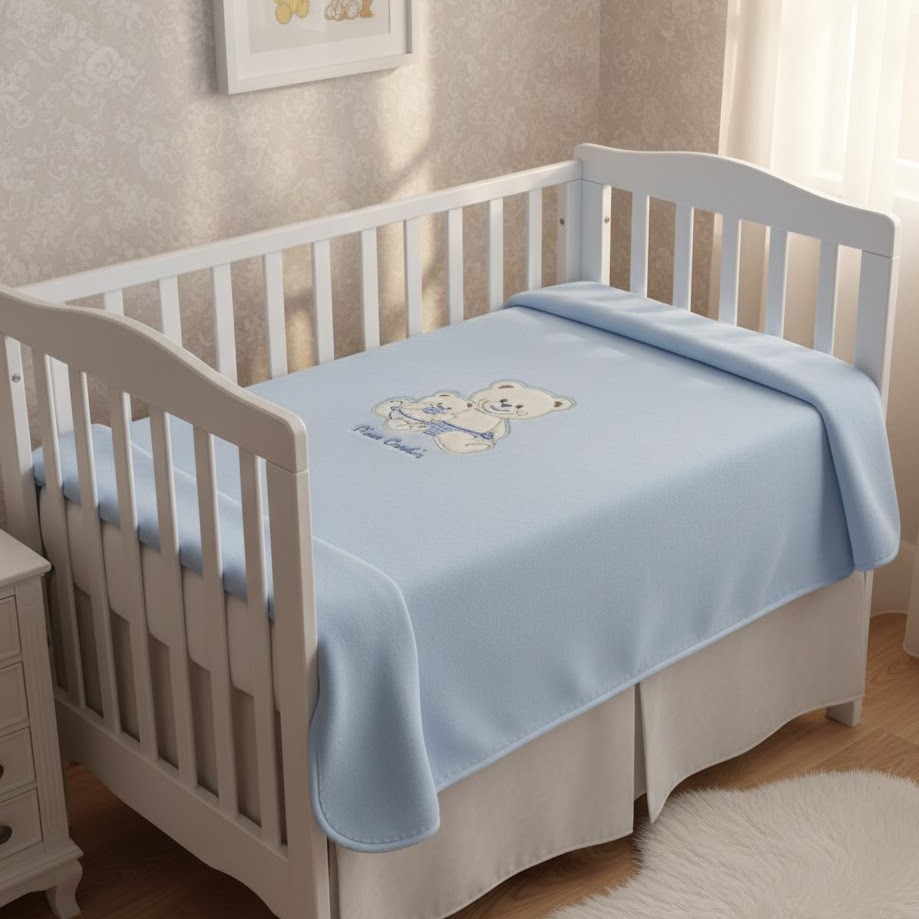 Cot blanket, dimensions 110x140, suitable for large cots. It is very soft, it is easy to use, made of soft velour, in blue colour with a bear. It is the ideal choice for your baby's winter sleep, offering warmth and comfort. Make the baby's crib even cosy and warm with this beautiful and practical blanket.