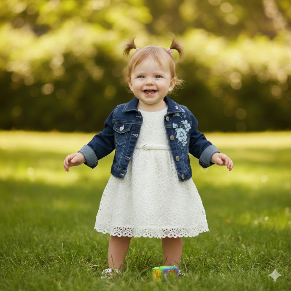 A baby dress in white color made of satin fabric with an inner lining of tulle for greater comfort and a feeling of softness on the baby's skin. The dress has an opening at the back to facilitate dressing and give an impressive effect to the design. The set comes with a baby denim bolero with embroidery, which pairs perfectly with the white dress for a complete look.