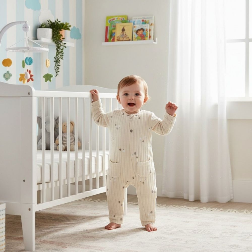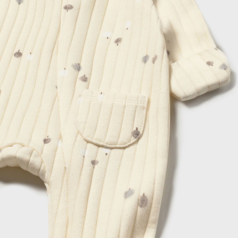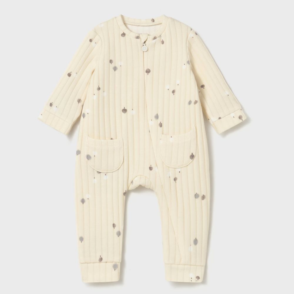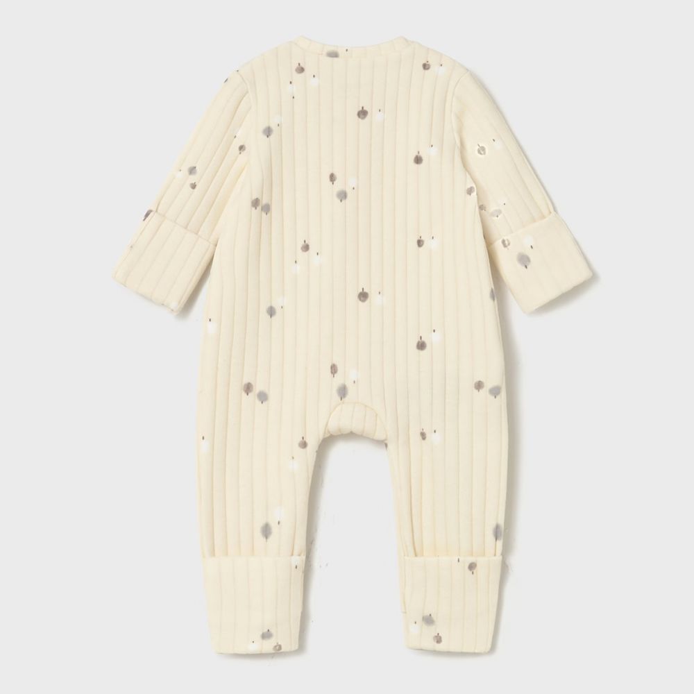 Cotton winter jumpsuit printed in the colors of the jungle. The one-piece pajama is embroidered with a hare and a bear. The opening in the baby bodysuit is at the front and at the crotch. It is made of stretchy fabric that gently hugs your baby.