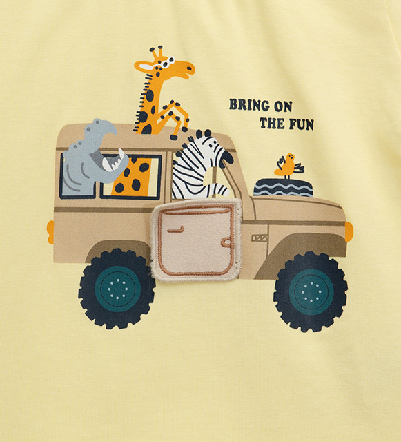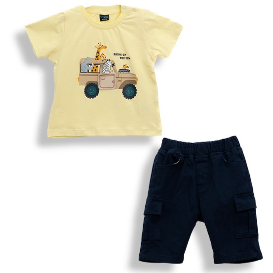 Baby clothing set consisting of a light blue cotton T-shirt and denim shorts. The T-shirt is short-sleeved, made of soft fabric. On the front it has a playful print depicting a safari jeep with various animals, such as a giraffe, a zebra and an elephant. The denim shorts are in a denim shade and have an elastic waist for a comfortable fit. It has two side pockets and two large "cargo" type pockets. Its style is casual and practical for everyday use.