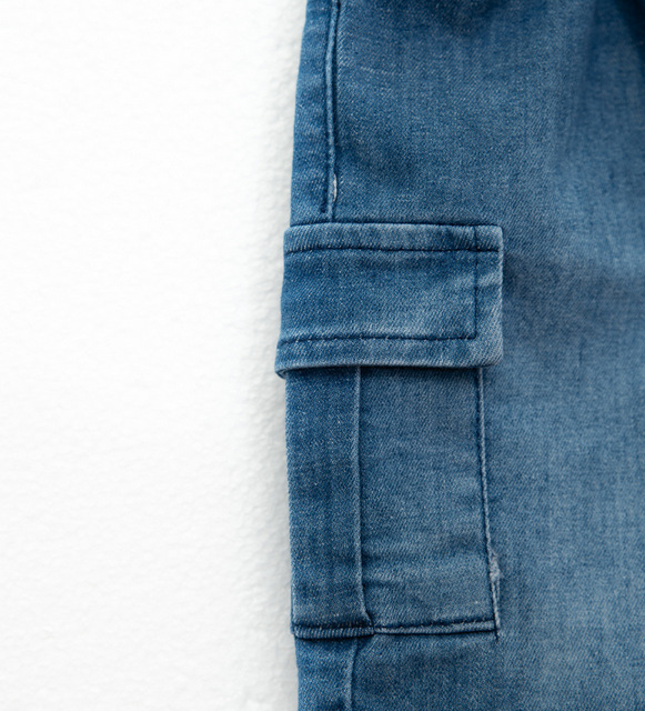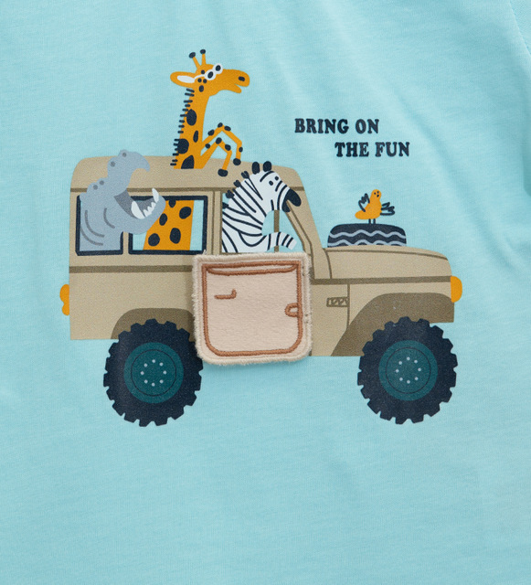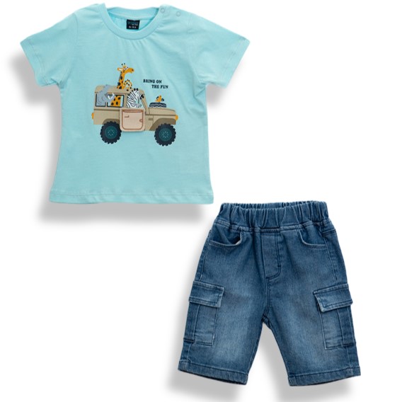 Baby clothing set consisting of a light blue cotton T-shirt and denim shorts. The T-shirt is short-sleeved, made of soft fabric. On the front it has a playful print depicting a safari jeep with various animals, such as a giraffe, a zebra and an elephant. The denim shorts are in a denim shade and have an elastic waist for a comfortable fit. It has two side pockets and two large "cargo" type pockets. Its style is casual and practical for everyday use.