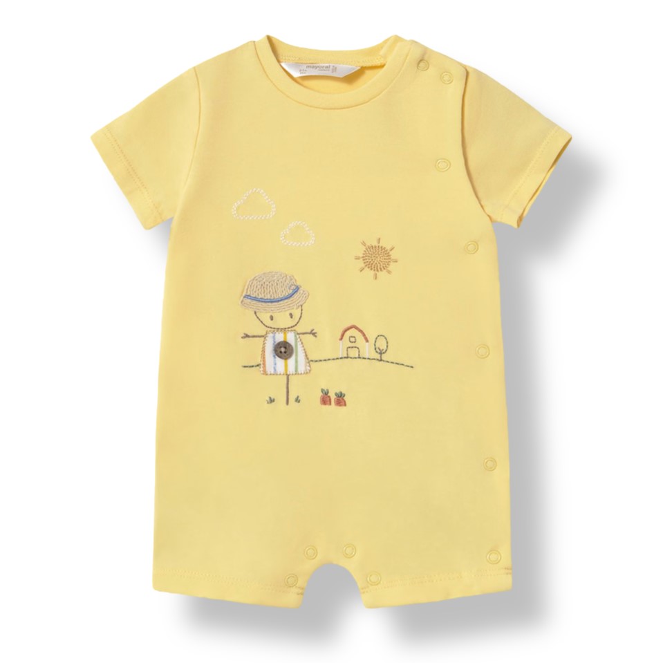 Summer bodysuit for newborn girl. The baby bodysuit is made of a soft jersey fabric of sustainable cultivation. The short-sleeved bodysuit is ideal for summer. The opening becomes the back and the crotch .Designally the bodysuit is white with yellow stripes and embroidery of a small bee.