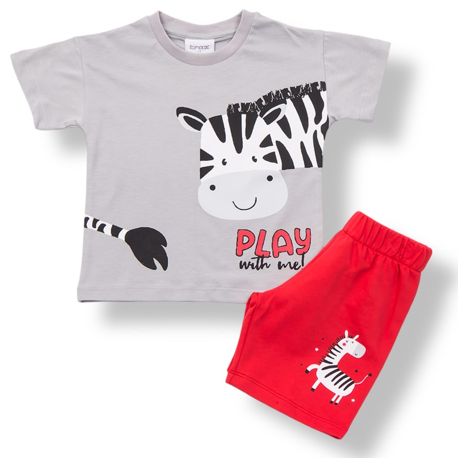 This cute children's clothing set for boys, ages 1 to 6, will become your little one's favorite companion on their daily adventures. It includes a gray short-sleeved top, decorated with a playful zebra, encouraging play and interaction. The red shorts complement the set perfectly, featuring a smaller zebra pattern on the side. Made of 100% cotton fabrics, the set offers comfort and freedom of movement, ideal for play and activities. The comfortable fit and durability of the fabric make it suitable for everyday use.