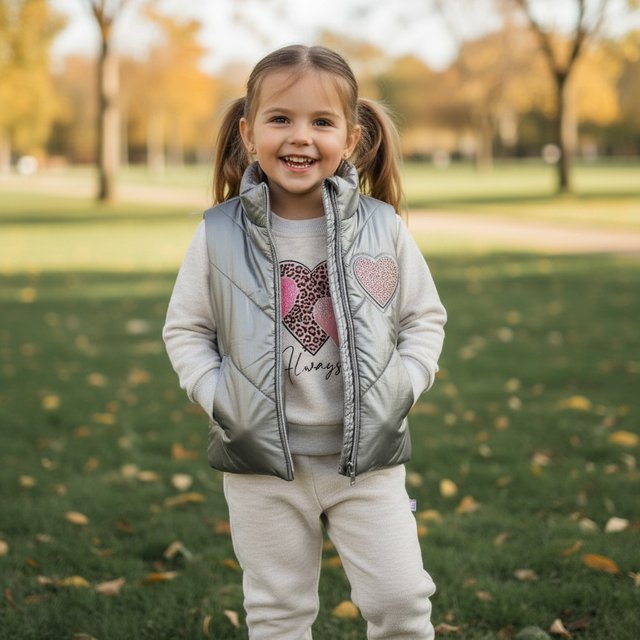 Children's 3-piece clothing set for girls, perfect for every little girl! The set includes a waterproof silver vest with embroidery and print, a beige melange blouse with a heart print and a pair of comfortable beige trousers. Made from high-quality fleece, this set combines practicality and style, ensuring comfort and style for your baby's daily outings. Ideal for every season, this set is the perfect choice to give your little girl an elegant and modern look.