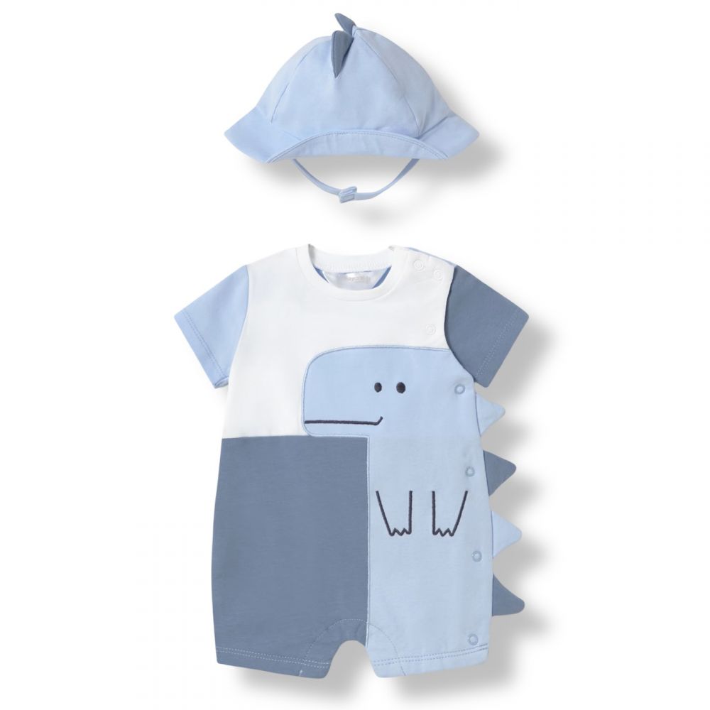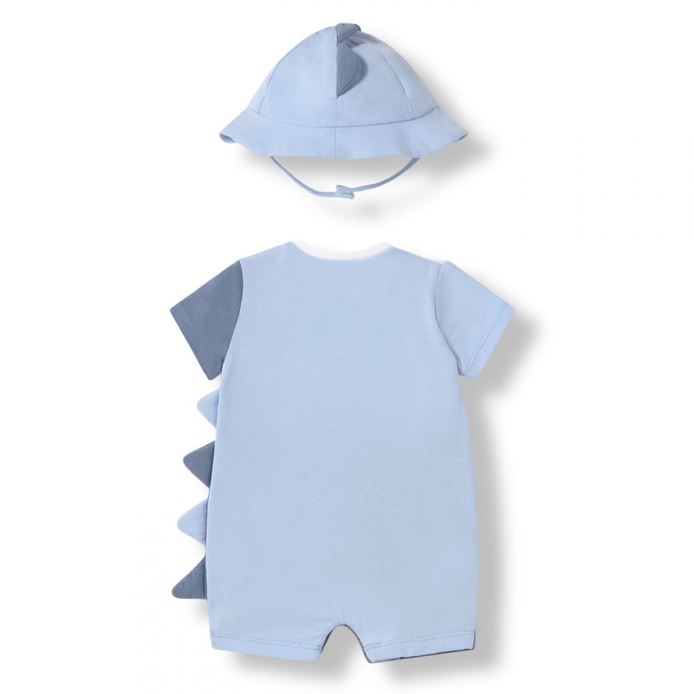 This cute baby set includes a bodysuit and a hat with a dinosaur design. The bodysuit is in shades of white and light blue, with a dinosaur design on the front and 3D spines on its back. The baby hat is in a matching light blue shade. The baby set is made of soft and comfortable fabric, ideal for baby's sensitive skin. It is ideal for everyday looks, walks and play.