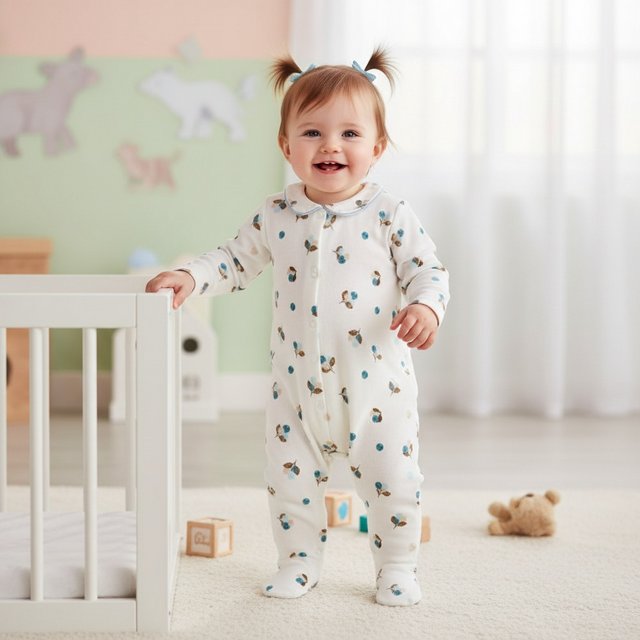 Long-sleeved baby onesie cream for baby girl. Includes feet. Contrasting grey color round neckline. Snap-buttons to fasten. Made with warm, cotton fabric with a soft, velvety feel.