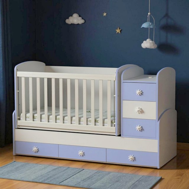 Multifunctional bed for your baby prince in white and blue colors to meet your needs for many years. The upper cushion is 70x130 interior and your child can use it for at least 5 years. The railing is adjustable and is ideal for future use of Daisy making it ideal for children up to 16 years. The lower bed is suitable for a 70x180 mattress. The 6 drawers and the baby cot holder are as large as a chest of drawers.