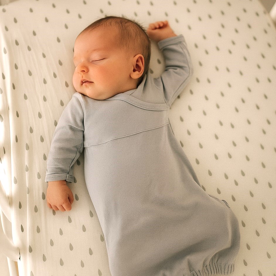 Sleeping bag for newborn baby in grey. The bodysuit with fringe is also suitable for the house with fringe. The night bag is made of mako interlock fabric 260gr 100% cotton. The baby bag is 58x28 and has 3 sheets of fabric on the sleeves to close the sleeve and not scratch the baby with its nails.