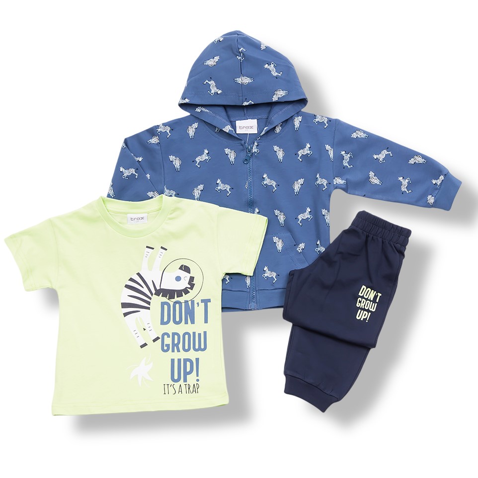 Update your child's wardrobe with this exciting 3-piece set for boys! The grey cardigan with printed designs in light blue, hood and pockets offers comfort and style. The white short-sleeved T-shirt is decorated with a cute aeroplane print, offering a cool and trendy look. The dark blue Trax elastic drawstring tracksuit pants are ideal for any activity, offering freedom of movement and comfort. This set is the perfect choice for a comfortable aviation-style outfit for your little pilot!