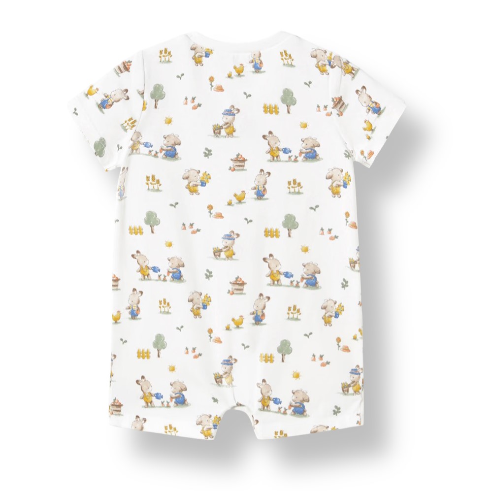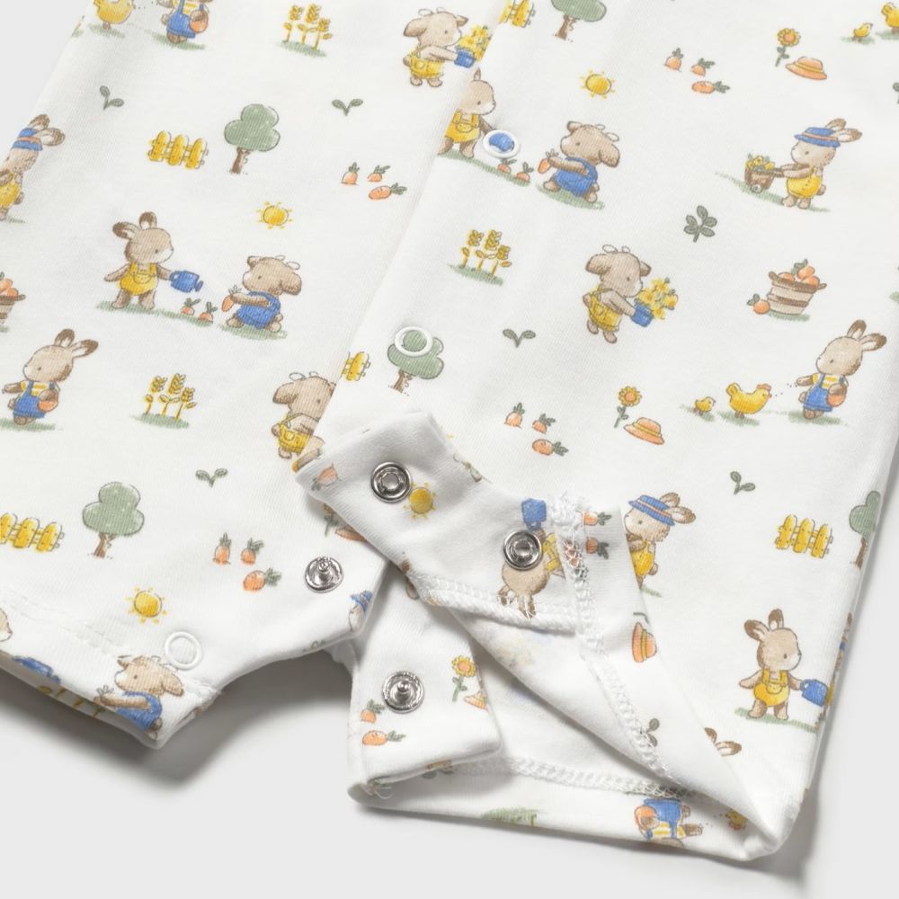 Summer sleeveless bodysuit white with grey. The baby bodysuit is in a wide line with a pleat on the sleeves and a daisy-style ruffle on the little lady's neck. The opening for changing the diaper is on the baby's back and crotch.