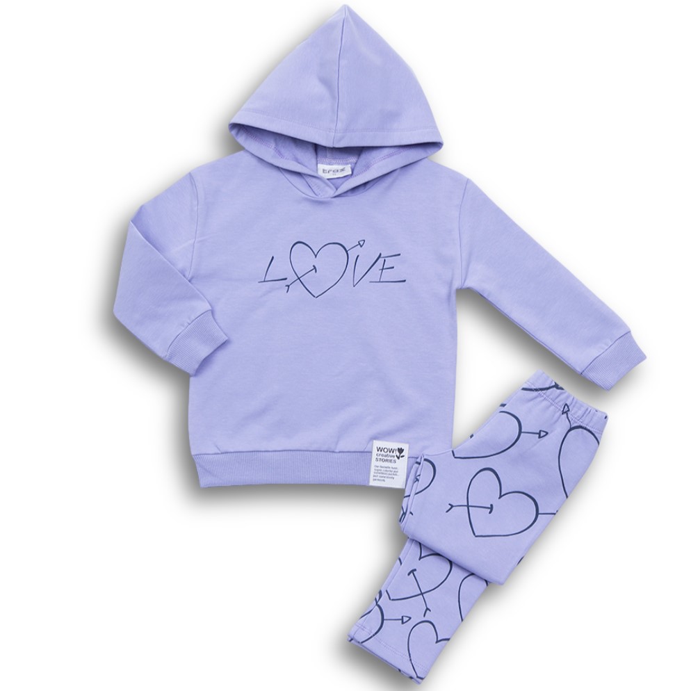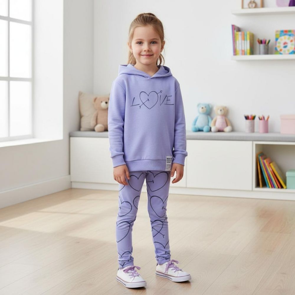 Get the most stylish winter tracksuit for girls from Trax, ideal for comfort and warmth. The set includes a lilac hoodie with a printed "LOVE" heart design, as well as pants with the same repeating pattern. Made of soft, high-quality sweatshirts, this tracksuit is perfect for school, play or relaxing moments at home. Give your child a modern and comfortable look that they will love all winter long. Available immediately from our store or shipped.