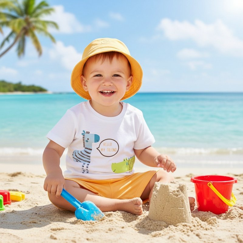 Kαλοκαιρινό σετ ρούχων για το μωράκι σας! Αυτό το σετ περιλαμβάνει ένα βρεφικό μακό μπλουζάκι με σταμπα safari, ένα άνετο σορτσάκι μωρού πορτοκαλί και ένα ασορτί πορτοκαλί βρεφικό καπέλο μακό, όλα με χαριτωμένα σχέδια που θα ενθουσιάσουν το μικρό σας. Κατασκευασμένο από δροσερά βαμβακερά υφάσματα, το σετ είναι ιδανικό για τις ζεστές μέρες, προσφέροντας άνεση και ελευθερία κινήσεων στο παιδί σας. Το καπέλο προστατεύει το μωρό από τον ήλιο, κάνοντας το σετ ιδανικό για τις καλοκαιρινές εξορμήσεις.