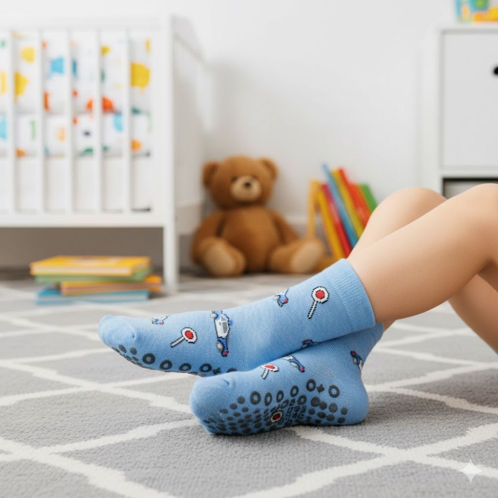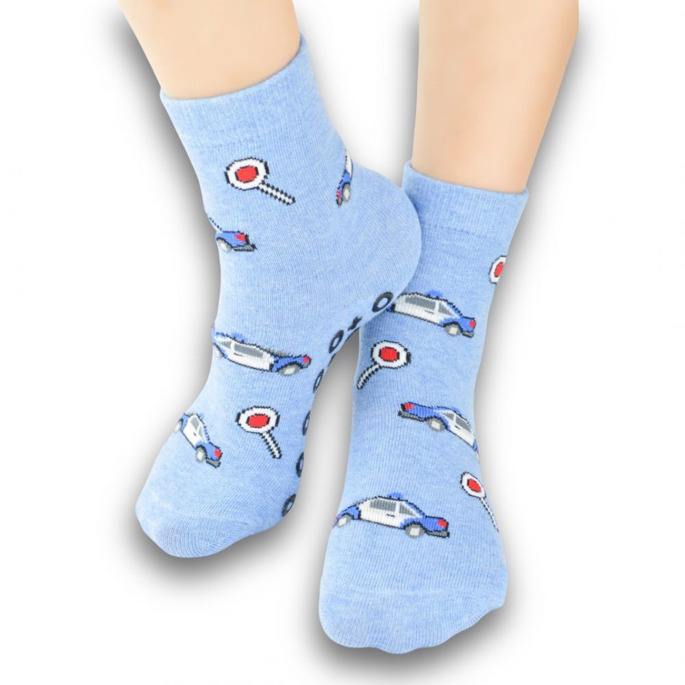 άνετα παιδικά καλτσάκια είναι ιδανικά για καθημερινή χρήση, προσφέροντας στυλ και ασφάλεια. Έχουν μια γαλάζια βάση, διακοσμημένα με αυτοκίνητα στον αστράγαλο, τη φτέρνα και τα δάχτυλα. Κατασκευασμένα με εύκαμπτη πλέξη, που εξασφαλίζει άνεση και καλή εφαρμογή στο πόδι του παιδιού.Στη σόλα, υπάρχουν μαύρα αντιολισθητικά λάστιχα (ή "ταπάκια") από ABS , τα οποία παρέχουν σταθερότητα και προστασία από ολίσθηση σε λείες επιφάνειες, καθιστώντας τα ιδανικά για παιχνίδι μέσα στο σπίτι.