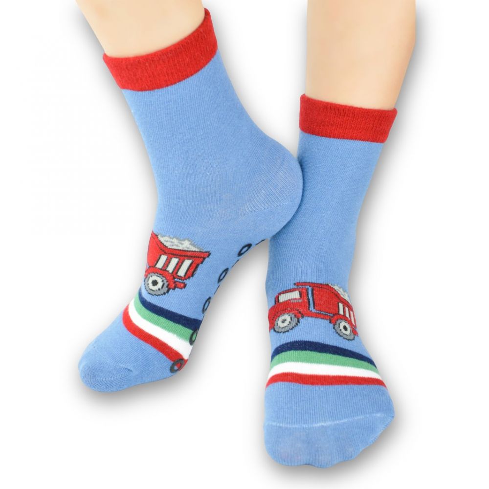 άνετα παιδικά καλτσάκια είναι ιδανικά για καθημερινή χρήση, προσφέροντας στυλ και ασφάλεια. Έχουν μια ευχάριστη σκούρα γαλάζια βάση, διακοσμημένα με πυροσβεστικό στον αστράγαλο, τη φτέρνα και τα δάχτυλα. Κατασκευασμένα με εύκαμπτη πλέξη, που εξασφαλίζει άνεση και καλή εφαρμογή στο πόδι του παιδιού.Στη σόλα, υπάρχουν μαύρα αντιολισθητικά λάστιχα (ή "ταπάκια") από ABS , τα οποία παρέχουν σταθερότητα και προστασία από ολίσθηση σε λείες επιφάνειες, καθιστώντας τα ιδανικά για παιχνίδι μέσα στο σπίτι.