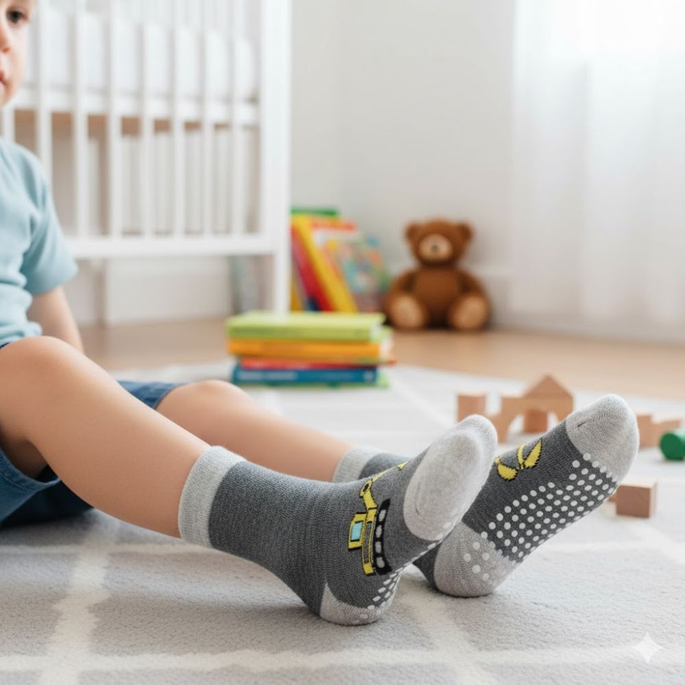 άνετα παιδικά καλτσάκια είναι ιδανικά για καθημερινή χρήση, προσφέροντας στυλ και ασφάλεια. Έχουν μια γκρι βάση, διακοσμημένα με εξκαφέα στον αστράγαλο, τη φτέρνα και τα δάχτυλα. Κατασκευασμένα με εύκαμπτη πλέξη, που εξασφαλίζει άνεση και καλή εφαρμογή στο πόδι του παιδιού.Στη σόλα, υπάρχουν μαύρα αντιολισθητικά λάστιχα (ή "ταπάκια") από ABS , τα οποία παρέχουν σταθερότητα και προστασία από ολίσθηση σε λείες επιφάνειες, καθιστώντας τα ιδανικά για παιχνίδι μέσα στο σπίτι.