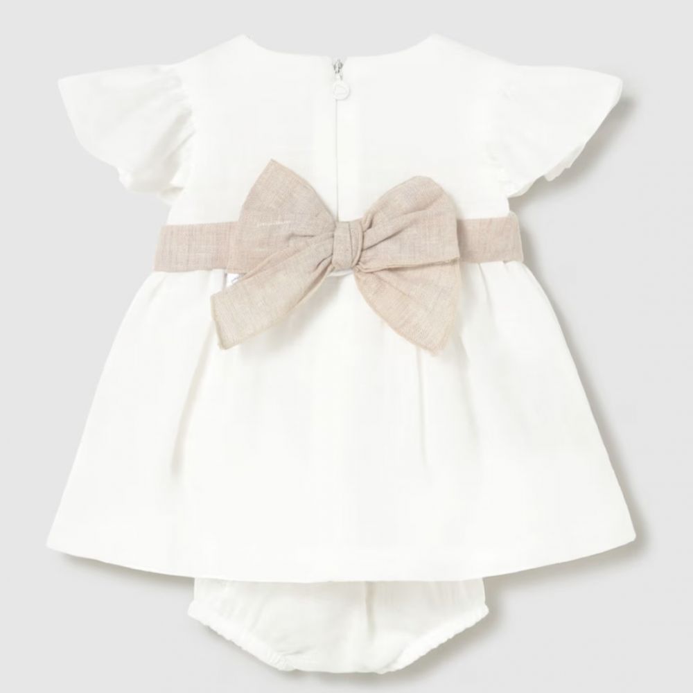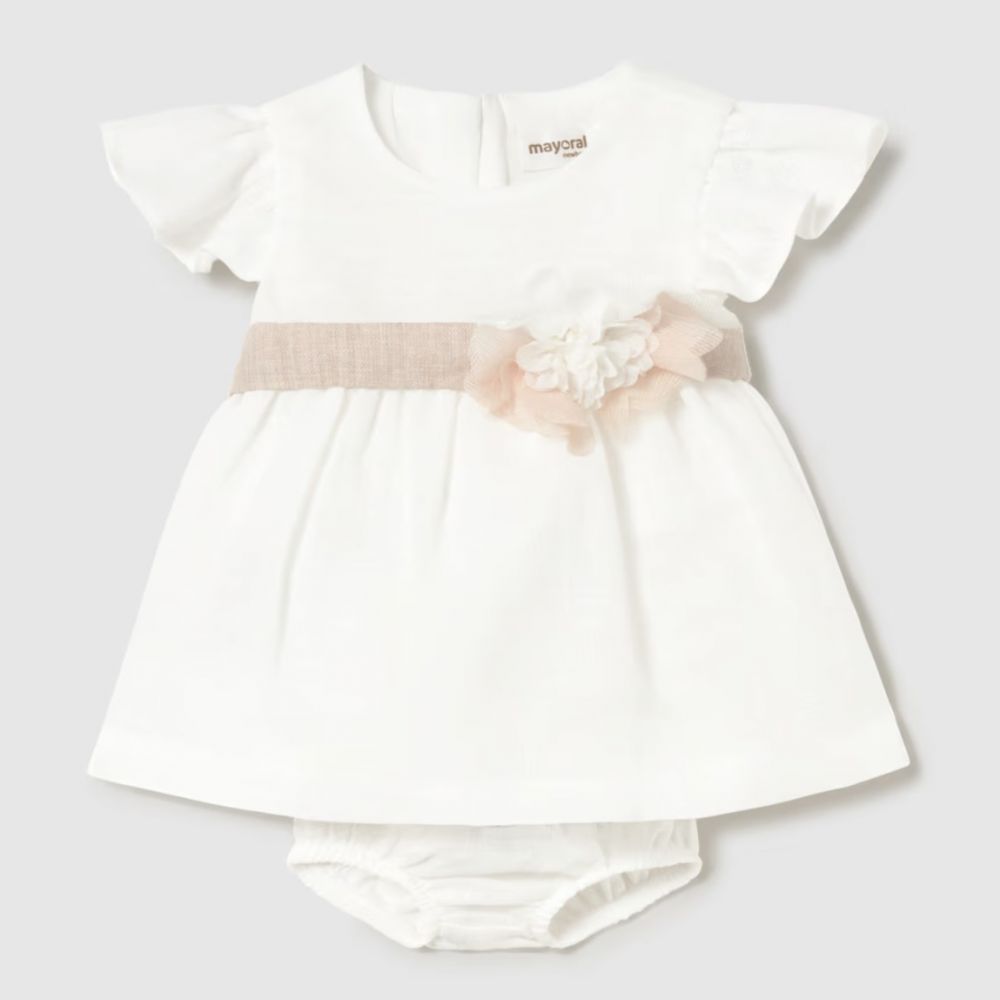 Βρεφικό επίσημο φόρεμα Mayoral κρεμ με μπεζ ζώνη και λουλούδι