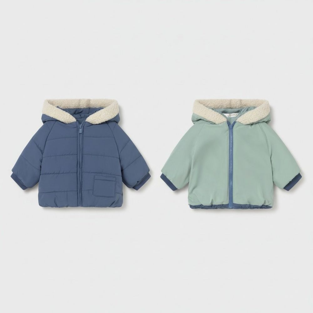 mayoral πρακτικό και κομψό βρεφικό μπουφάν διπλής όψης, ιδανικό για να κρατάει το μωρό σας ζεστό. Η μία όψη είναι σε ένα ήρεμο, μπλε χρώμα, με διακριτική καπιτονέ υφή, ενώ η άλλη όψη είναι σε απαλό, μέντα πράσινο. Και οι δύο πλευρές διαθέτουν κουκούλα με επένδυση από χνουδωτή, κρεμ fleece, προσφέροντας επιπλέον ζεστασιά και απαλότητα. Με λάστιχο στα μανίκια και στο κάτω μέρος για καλύτερη εφαρμογή, αυτό το μπουφάν είναι η τέλεια επιλογή για τις ψυχρές μέρες. Διαθέτει επίσης φερμουάρ για εύκολο ντύσιμο.