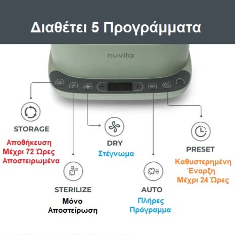 - Διατηρεί τα αξεσουάρ αποστειρωμένα για έως και 72 ώρες με τη λειτουργία "Αποθήκευση".