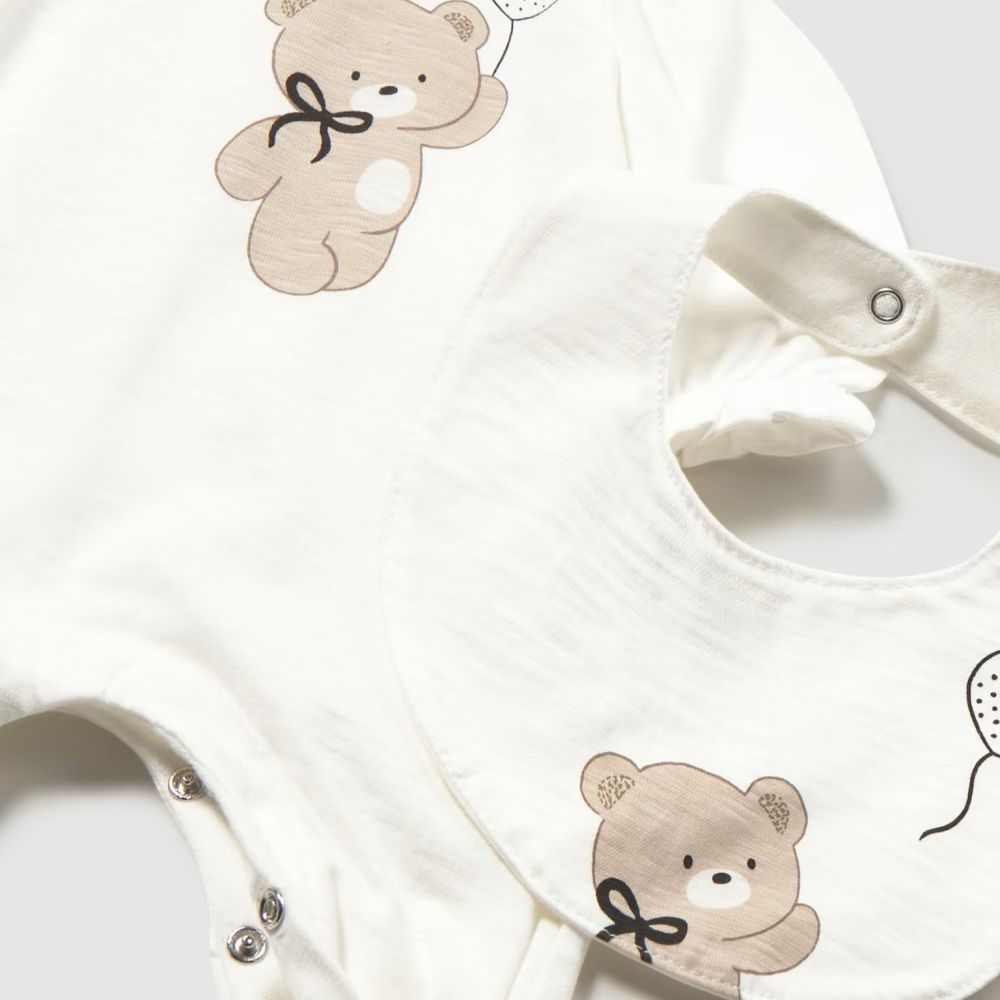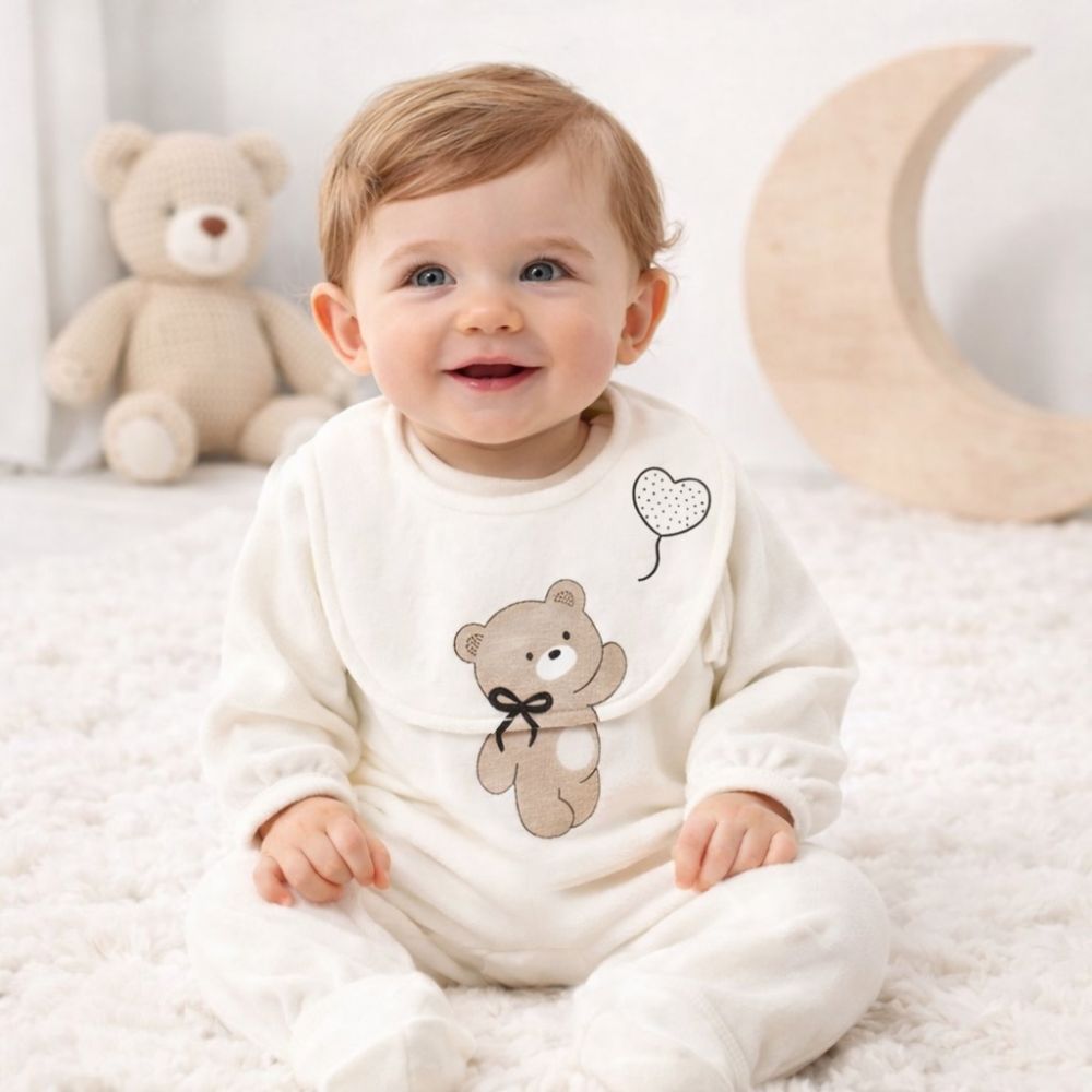 - Ολοκληρωμένο Σετ: Περιλαμβάνει μακρυμάνικο ολόσωμο φορμάκι με πατουσάκια και ασορτί σαλιάρα που κουμπώνει με clips για μέγιστη ευκολία.