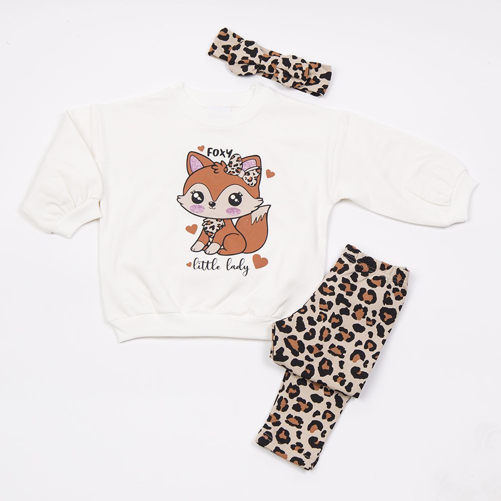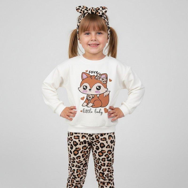 Αυτό το χαριτωμένο παιδικό σετ για κορίτσια είναι ιδανικό για παιχνίδι και άνεση. Περιλαμβάνει ένα φούτερ μπλουζάκι σε εκρού χρώμα με μια γλυκιά στάμπα αλεπούς, ένα ασορτί κολάν με λεοπάρ σχέδιο, και μια κορδέλα μαλλιών για ένα ολοκληρωμένο look. Η σύνθεση από 95% βαμβάκι και 5% πολυεστέρα εξασφαλίζει απαλή αίσθηση και άνεση. Μια μοντέρνα και άνετη επιλογή για το κορίτσι σας.