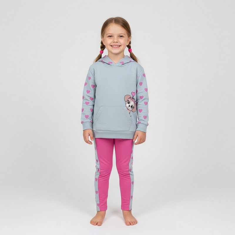 Παιδική φόρμα για κορίτσια μέντα φούξια .Ιδανική για τις φθινοπωρινές και χειμωνιάτικες ημέρες, αυτή η παιδική φόρμα για κορίτσια προσφέρει ζεστασιά και άνεση. Η σύνθεσή της από 95% βαμβάκι και 5% ελαστίνη εξασφαλίζει απαλή αίσθηση και ελευθερία κινήσεων. Το σετ περιλαμβάνει φούτερ με κουκούλα με χαριτωμένο σχέδιο και print με καρδούλες, καθώς και ένα άνετο κολάν σε έντονο φούξια χρώμα. Ένα στιλάτο και πρακτικό σύνολο για κάθε μικρό κορίτσι.