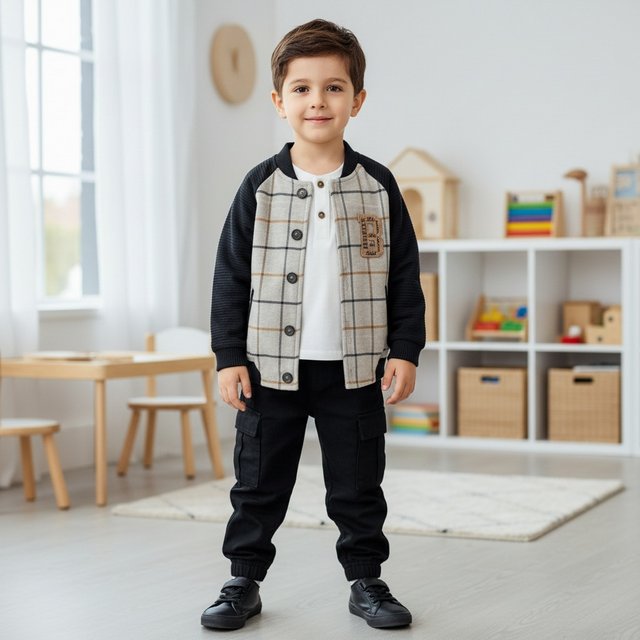 Παιδικό σετ ρούχων για αγόρια, ιδανικό για μοντέρνες εμφανίσεις. Το σετ περιλαμβάνει ένα στυλάτο μπουφάν-ζακέτα με καρό μοτίβο εσωτερικά φοδραρισμένο και μονόχρωμα μανίκια, που προσφέρει ζεστασιά και στυλ. Συνδυάζεται με ένα άνετο, μακρυμάνικο λευκό μπλουζάκι μακό και ένα μαύρο παντελονάκι-τζιν με τσέπες cargo, σχεδιασμένο για απόλυτη ελευθερία κινήσεων. Κατάλληλο για παιδιά από 1 έως 5 ετών, αυτό το versatile σετ είναι η τέλεια επιλογή για παιχνίδι, βόλτα ή μια casual εμφάνιση