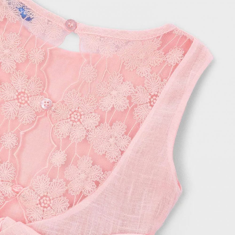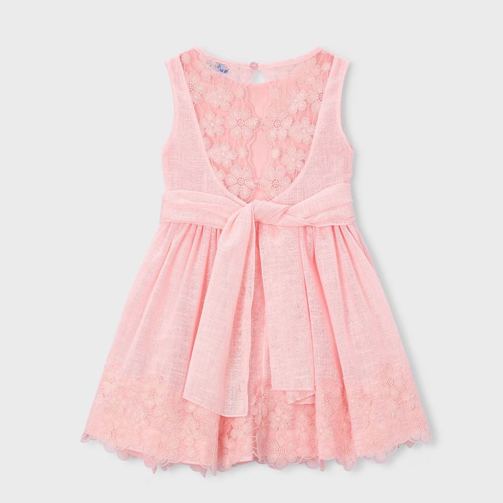 Εντυπωσιάστε σε κάθε επίσημη περίσταση με το παιδικό φόρεμα σε υπέροχη blossom απόχρωση. Το φόρεμα ξεχωρίζει για την εκλεπτυσμένη δαντέλα που κοσμεί την πλάτη, προσδίδοντας μια αίσθηση πολυτέλειας. Διαθέτει κομψή ζώνη που δένει σε μεγάλο φιόγκο πίσω και ντελικάτα κεντημένα λουλούδια στο τελείωμα. Κατασκευασμένο από υφάσματα υψηλής ποιότητας με εσωτερική επένδυση, προσφέρει άνεση και στυλ σε κορίτσια από 2 έως 6 ετών. Η ιδανική επιλογή για γάμους και βαπτίσεις που θα μαγέψει τις μικρές σας κυρίες.