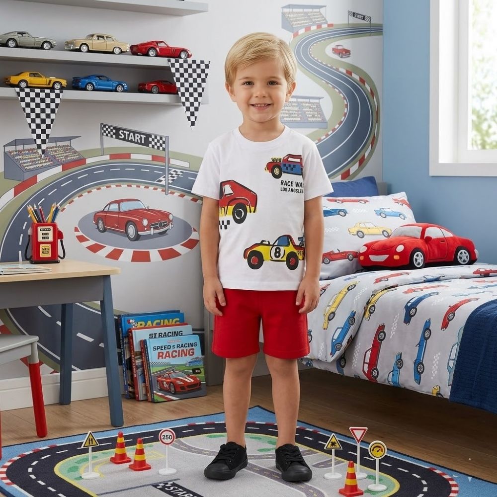 - Δροσερό Design: Η λευκή μπλούζα διαθέτει παιχνιδιάρικες στάμπες με vintage αγωνιστικά αυτοκινητάκια, τον αριθμό "8", και το λογότυπο "RACE WAY LOS ANGELES".