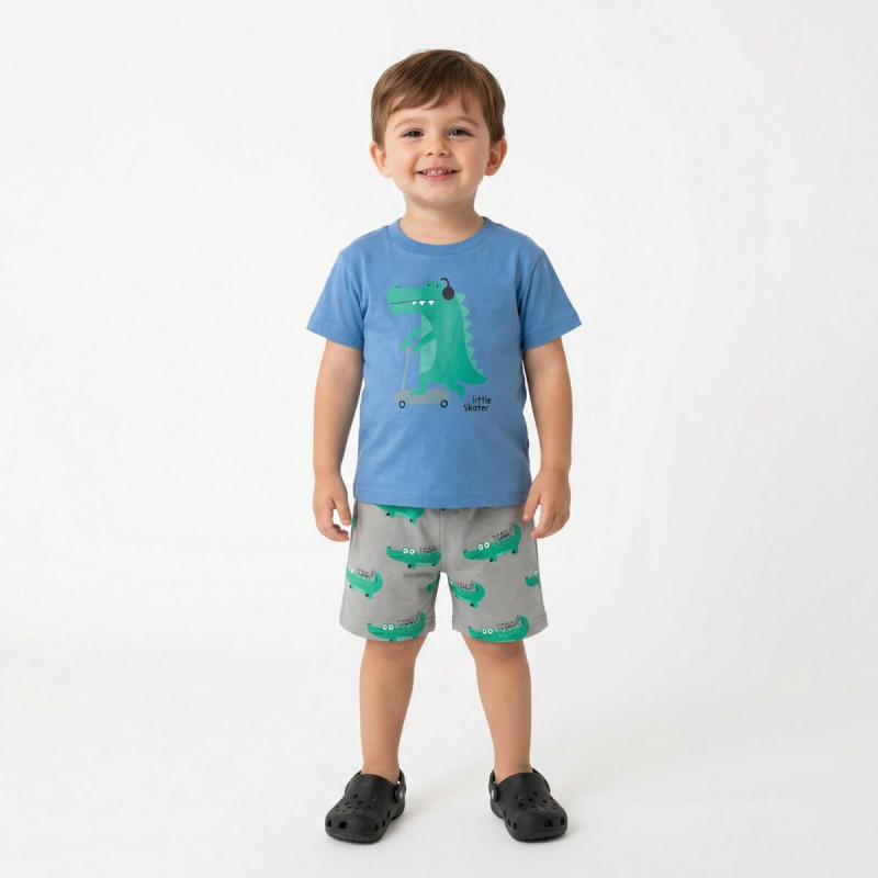 - Παιχνιδιάρικο Design: Η μπλούζα σε υπέροχη γαλάζια απόχρωση απεικονίζει έναν κροκόδειλο με ακουστικά πάνω σε πατίνι ("Little Skater"), ενώ το γκρι σορτσάκι είναι γεμάτο με μικρά, χαριτωμένα κροκοδειλάκια.