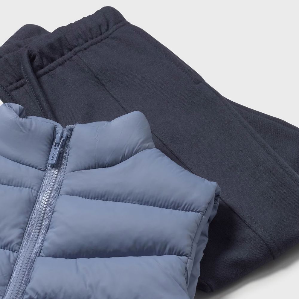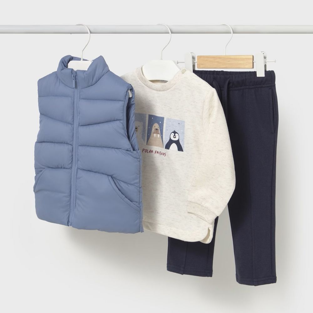 Παιδικό σετ για αγόρια μπλε που συνδυάζει μια άνετη μπλούζα με σχέδιο , αμάνικο μπουφαν και παντελόνι φόρμας για να κρατά το μικρό σας ζεστό και στιλάτο. Ιδανικό για κρύες ημέρες, το σετ αυτό προσφέρει άνεση και ελευθερία κινήσεων, ενώ το χαρούμενο σχέδιο το καθιστά ιδανικό για μικρούς λάτρεις της περιπέτειας. Με τη γκρι και μπλε απόχρωση, το σετ είναι πρακτικό για καθημερινές εμφανίσεις και εξορμήσεις στην πόλη ή το παιχνίδι!
