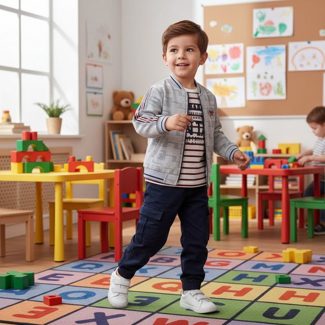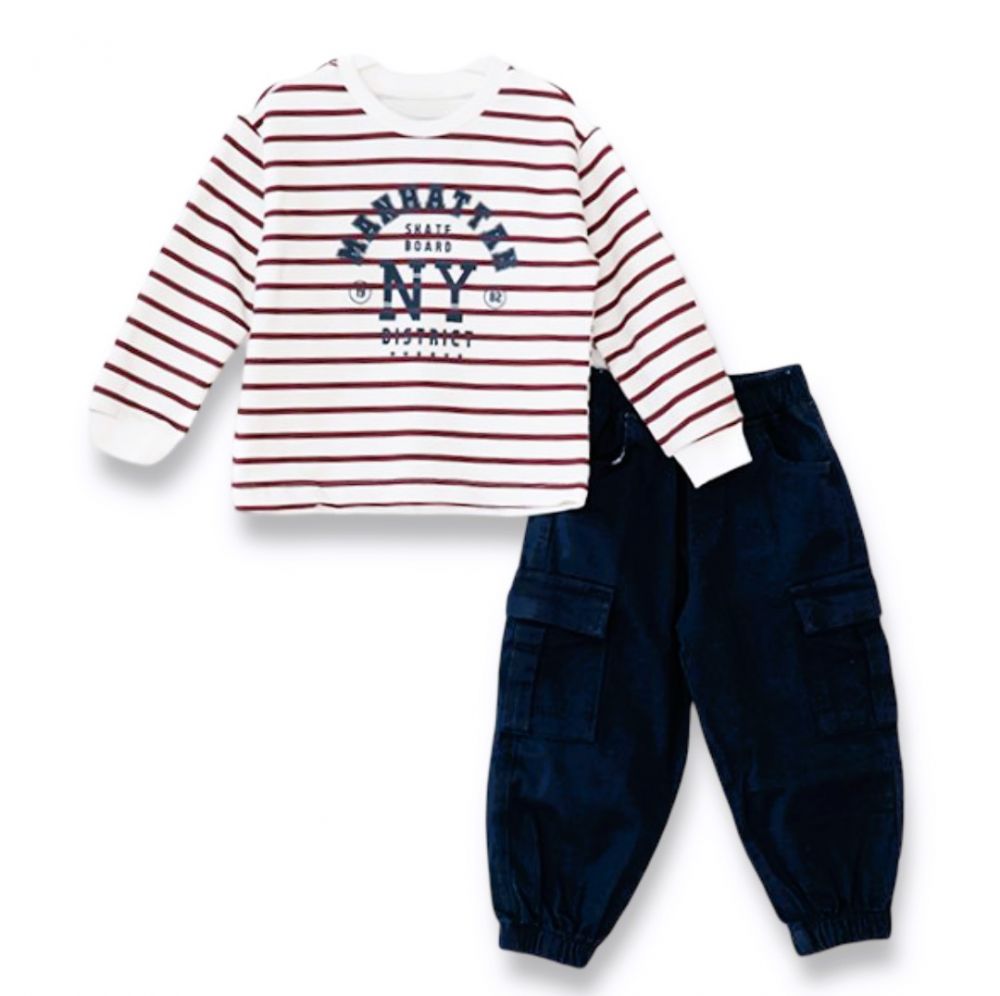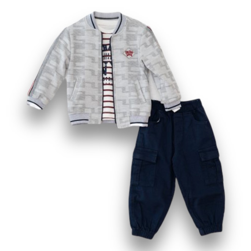 Παιδικό σετ ρούχων για αγόρια, κατάλληλο φθινόπωρο και χειμώνα. Περιλαμβάνει ένα αθλητικό μπουφάν με ανάγλυφο σχέδιο και patch "New York Athletic", ένα ριγέ μακρυμάνικο T-shirt με στάμπα "Manhattan Skateboard N.Y.", και ένα άνετο παντελόνι cargo σε μπλε χρώμα. Ένα μοντέρνο και άνετο σύνολο, ιδανικό για καθημερινό παιχνίδι και βόλτες, προσφέροντας ζεστασιά και στυλ.