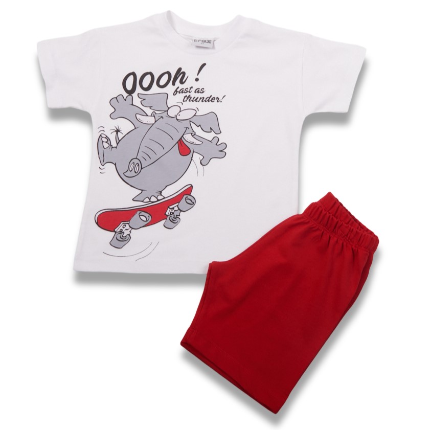 Το Παιδικό σετ "Oooh! Fast as Thunder!" είναι ιδανικό για τους μικρούς μας φίλους που αγαπούν την περιπέτεια! Συνδυάζει στυλ και άνεση, προσφέροντας μια παιχνιδιάρικη και μοντέρνα επιλογή για τις καθημερινές τους δραστηριότητες. Η λευκό παιδική μπλούζα , διαθέτει ένα χαρούμενο σχέδιο με ελέφαντα σε skateboard και την επιγραφή "Oooh! Fast as Thunder!", ενώ η ζωηρή κόκκινη βερμούδα, με ελαστική μέση, εξασφαλίζει άνετη εφαρμογή. Κατασκευασμένο στην Ελλάδα από υψηλής ποιότητας μακό υφάσματα, αυτό το σετ είναι ανθεκτικό και προσφέρει άνεση καθ' όλη τη διάρκεια της ημέρας. Είναι ιδανικό για παιχνίδι, βόλτες και άλλες δραστηριότητες.