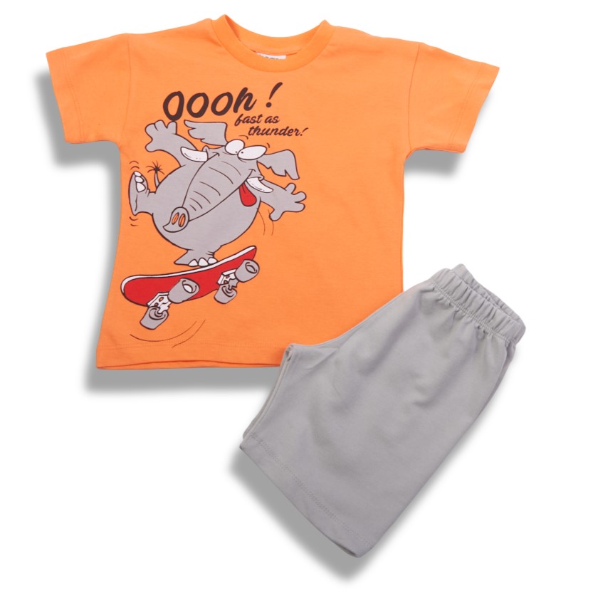Το Παιδικό σετ "Oooh! Fast as Thunder!" είναι ιδανικό για τους μικρούς μας φίλους που αγαπούν την περιπέτεια! Συνδυάζει στυλ και άνεση, προσφέροντας μια παιχνιδιάρικη και μοντέρνα επιλογή για τις καθημερινές τους δραστηριότητες. Η μπλούζα, σε εντυπωσιακό πορτοκαλί χρώμα, διαθέτει ένα χαρούμενο σχέδιο με ελέφαντα σε skateboard και την επιγραφή "Oooh! Fast as Thunder!", ενώ η απαλή γκρι βερμούδα, με ελαστική μέση, εξασφαλίζει άνετη εφαρμογή. Κατασκευασμένο στην Ελλάδα από υψηλής ποιότητας μακό υφάσματα, αυτό το σετ είναι ανθεκτικό και προσφέρει άνεση καθ' όλη τη διάρκεια της ημέρας. Είναι ιδανικό για παιχνίδι, βόλτες και άλλες δραστηριότητες.