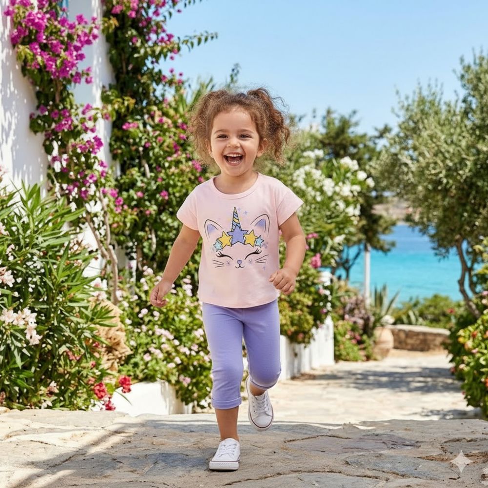 - Κολάν Κάπρι (95% Cotton / 5% Elastan): Σε υπέροχη λιλά απόχρωση, με την ιδανική ελαστικότητα ώστε να ακολουθεί κάθε κίνηση του παιδιού με ευκολία και άνεση.
