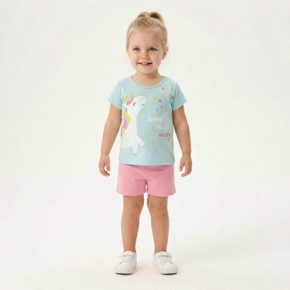 - Χρώματα: milky blue (μπλούζα) και ροζ παιδικό σορτς.