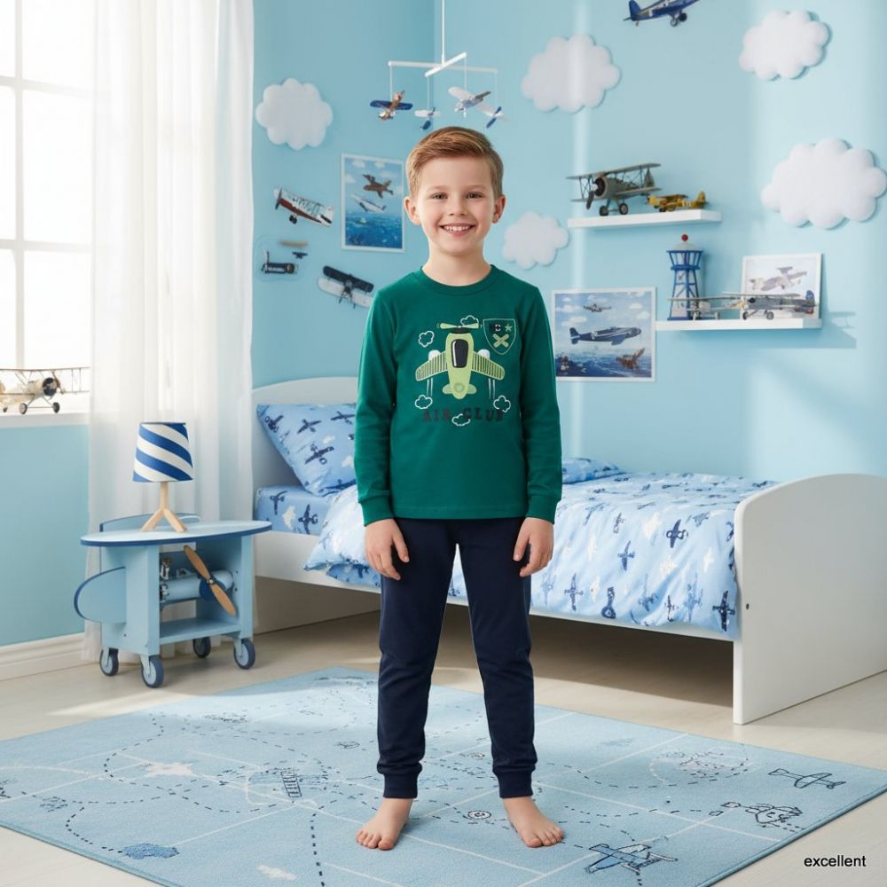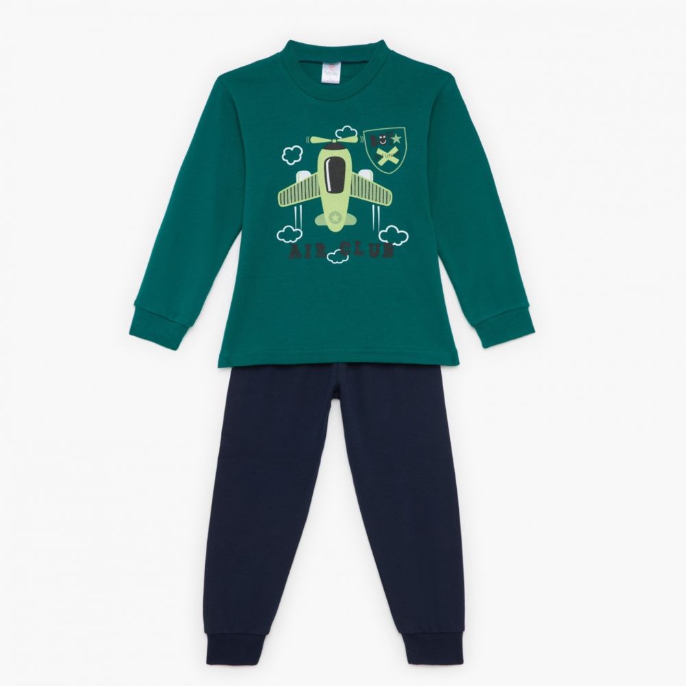 παιδική πιτζάμα για αγόρια. Αυτή η ελληνική πιτζάμα είναι η ιδανική επιλογή για άνετους χειμερινούς ύπνους. Κατασκευασμένη από εξαιρετικά μαλακό 100% βαμβακερό πενιέ ύφασμα, προσφέρει απαλή αίσθηση και επιτρέπει στο δέρμα να αναπνέει. Το πάνω μέρος σε βαθύ πράσινο χρώμα διαθέτει ένα εντυπωσιακό σχέδιο με αεροπλάνο και την επιγραφή "AIR CLUB", περιτριγυρισμένο από συννεφάκια, ιδανικό για μικρούς λάτρεις της πτήσης. Το παντελόνι είναι σε σκούρο μπλε χρώμα, δημιουργώντας μια όμορφη αντίθεση. Χάρη στην ελληνική ποιότητα, είναι ανθεκτική και διατηρεί το σχήμα της μετά από πολλά πλυσίματα. Ένα must-have για το βρεφικό και παιδικό ντύσιμο!
