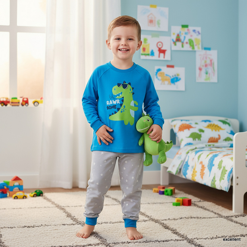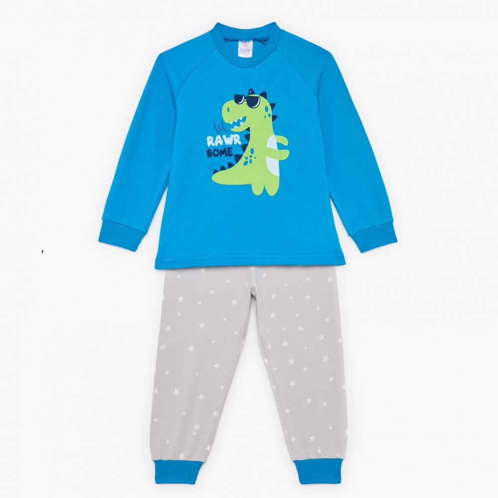 Παιδική πυτζάμα για αγόρια ελληνικής κατασκευής, από 100% ασφαλές πενιέ βαμβακερό ύφασμα για άνετο και ποιοτικό ύπνο. Το σετ περιλαμβάνει μπλούζα με μακριά μανίκια σε έντονο γαλάζιο χρώμα και ένα παιχνιδιάρικο τύπωμα δεινοσαύρου με γυαλιά ηλίου και τη φράση "RAWR SOME".Το παιδικό παντελόνι είναι σε ανοιχτό γκρι χρώμα με all-over σχέδιο από λευκά αστεράκια και διαθέτει λάστιχο στη μέση και στα τελειώματα για σταθερή εφαρμογή. Η πυτζάμα είναι απαλή, ζεστή και ανθεκτική, ιδανική για τους χειμερινούς μήνες. Ένα άνετο και μοντέρνο σετ για την νύχτα.