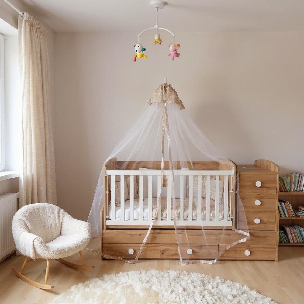 Ένα Πρακτικό βρεφικό έπιπλο κουνιστό σε συνδυασμό με συρταρίερα και αλλαξιέρα και χώρο αποθήκευσης άπλυτων ρούχων για εξοικονόμηση χώρου.
