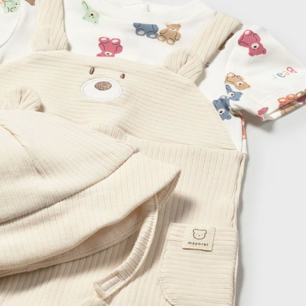 - Συνδυασμένο T-shirt: Η σαλοπέτα συνοδεύεται από λευκό κοντομάνικο μπλουζάκι με διακριτικό print από πολύχρωμα αρκουδάκια σε όλη την επιφάνεια.