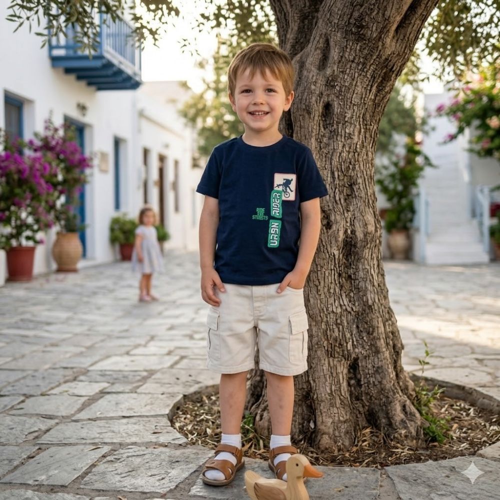 - Μακό Μπλουζάκι Navy Blue: Από 100% ποιοτικό βαμβακερό ύφασμα (μακό) που αναπνέει. Διαθέτει μοντέρνο τύπωμα "Urban Rider" και "Ride the Streets", εμπνευσμένο από το BMX και το street style, που θα λατρέψει κάθε παιδί.