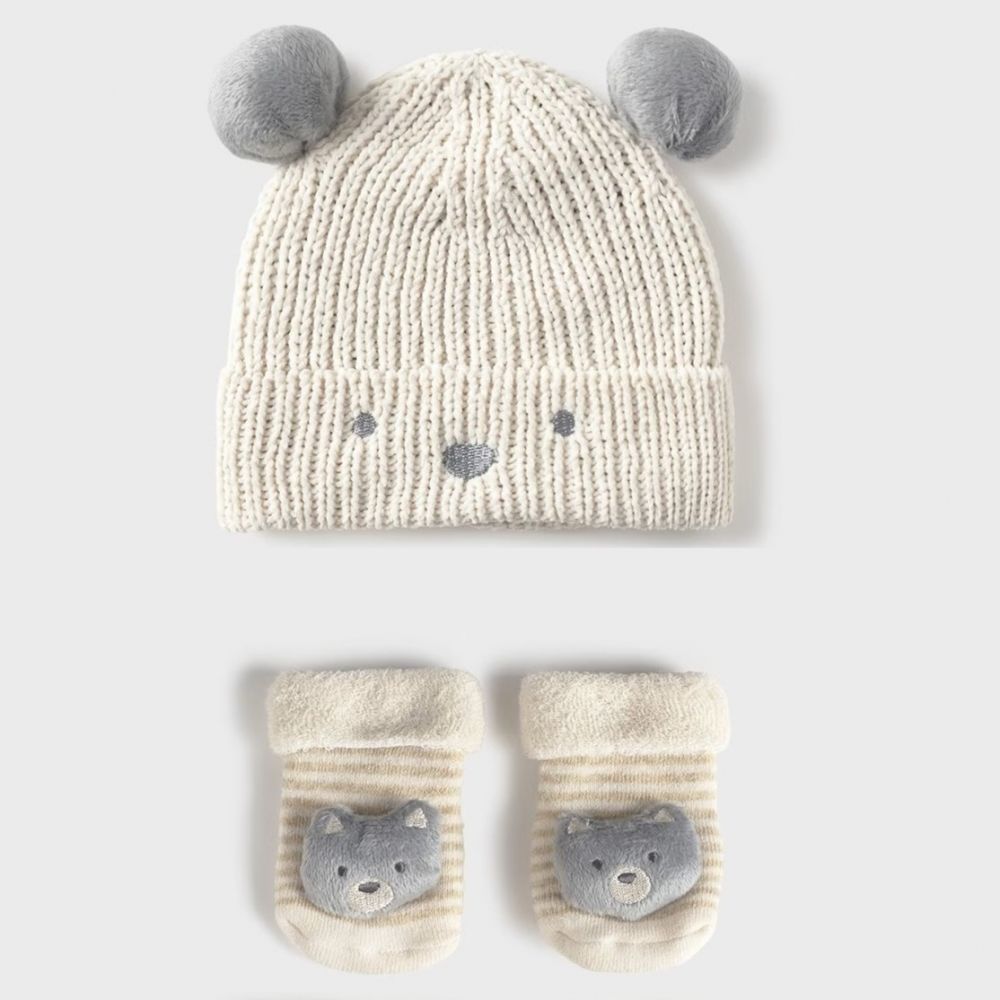 Πλεκτό βρεφικό σετ με σκουφάκι και καλτσάκια, σε κρεμ χρώμα. Το σκουφάκι έχει σχέδιο αρκουδάκι με δύο γούνινα πον πον που μοιάζουν με αυτιά. Τα καλτσάκια είναι ριγέ σε κρεμ και μπεζ αποχρώσεις, με αντιολισθητική σόλα και διαθέτουν επίσης ένα χαριτωμένο αρκουδάκι. Ένα ζεστό και χαριτωμένο σετ για βρέφη.