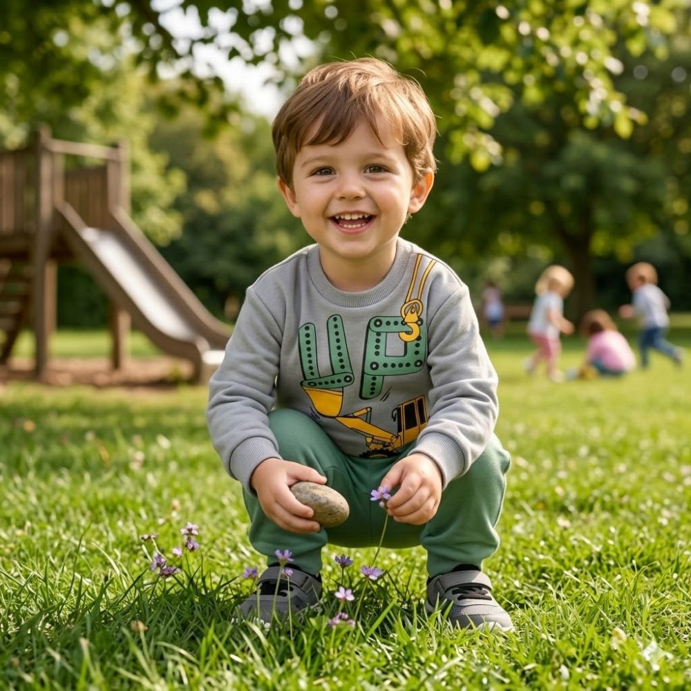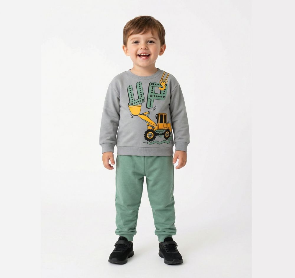 - Μοντέρνο Σχέδιο: Το σετ περιλαμβάνει γκρι μπλούζα με εντυπωσιακή στάμπα "UP" και εκσκαφέα, συνδυασμένη με άνετο πράσινο παντελόνι φόρμας με λάστιχο στα μπατζάκια για σταθερή εφαρμογή.