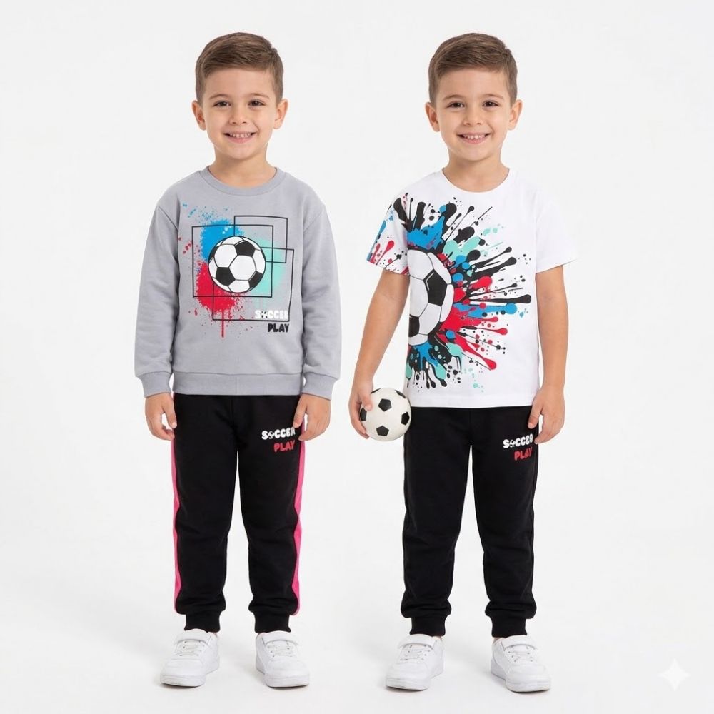 - Μπλούζα Φούτερ: Μακρυμάνικη, σε γκρι χρώμα με μοντέρνα στάμπα "Soccer Play" και μπάλα ποδοσφαίρου.