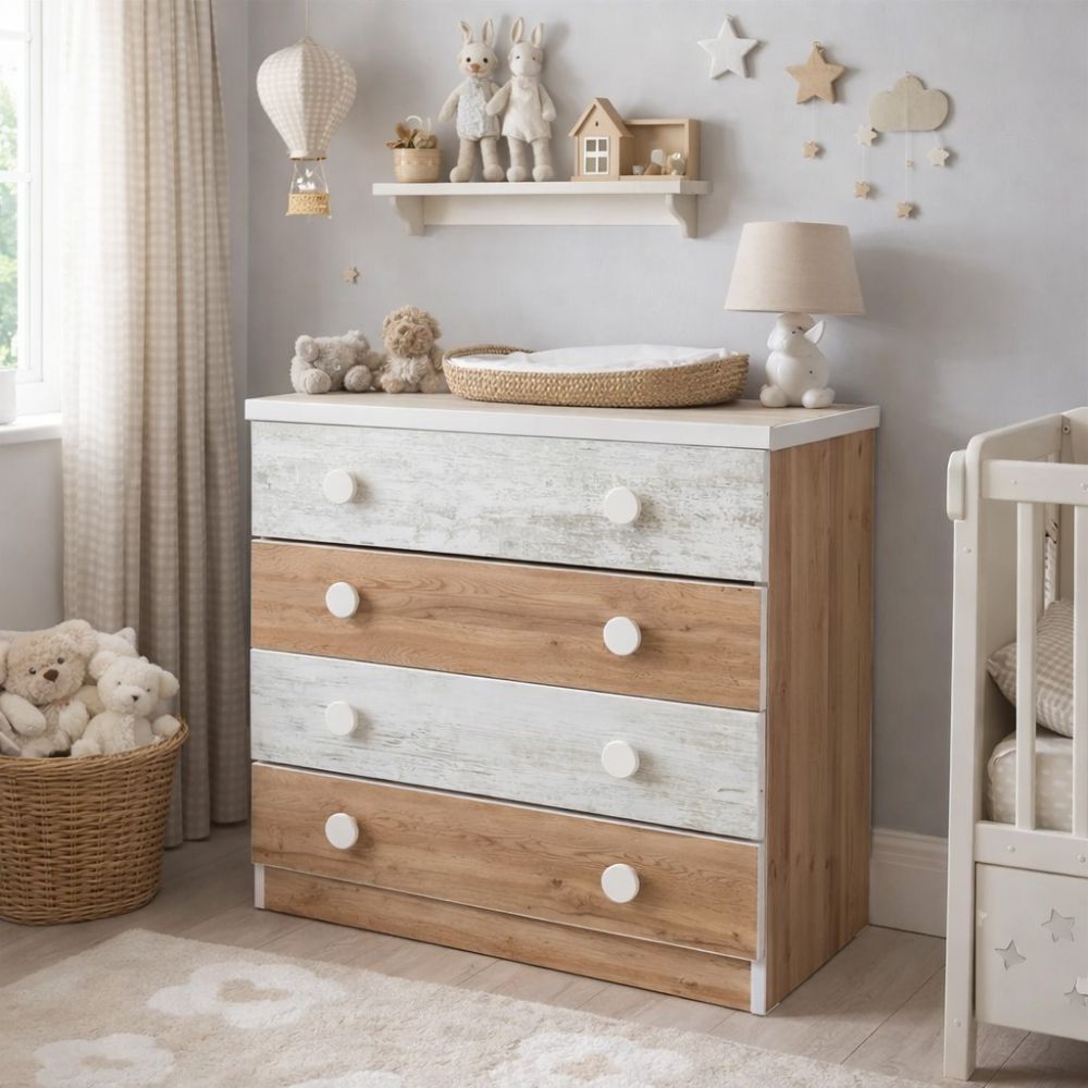- Η σιφονιέρα διαθέτει τέσσερα ευρύχωρα συρτάρια που προσφέρουν άνετη αποθήκευση για ρούχα, λευκά είδη και απαραίτητα του μωρού. Η εργονομική διάταξη βοηθά στην εύκολη οργάνωση, ενώ οι πρακτικές λαβές επιτρέπουν άνοιγμα χωρίς κόπο.