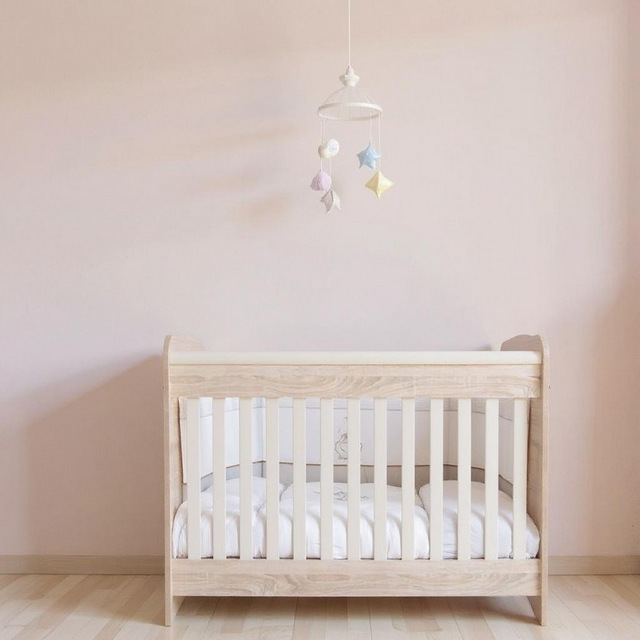 - Η βρεφική κούνια είναι στο χρώμα της βελανιδιάς και τα εμπρός φυλλαράκια και η άνω κουπαστή κρεμ