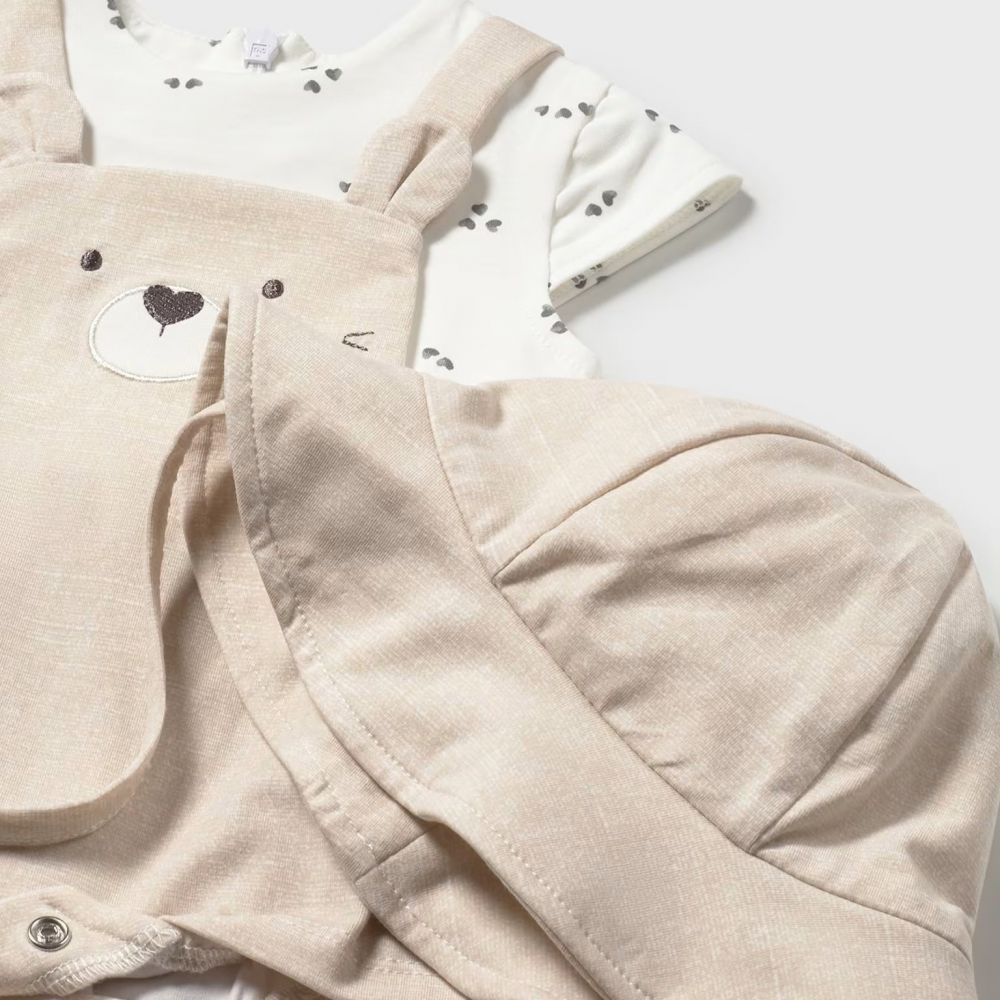 Σχεδιασμός: Φορμάκι με ενσωματωμένη φούστα και χαριτωμένο κέντημα αρκουδάκι με αυτάκια στο στήθος.