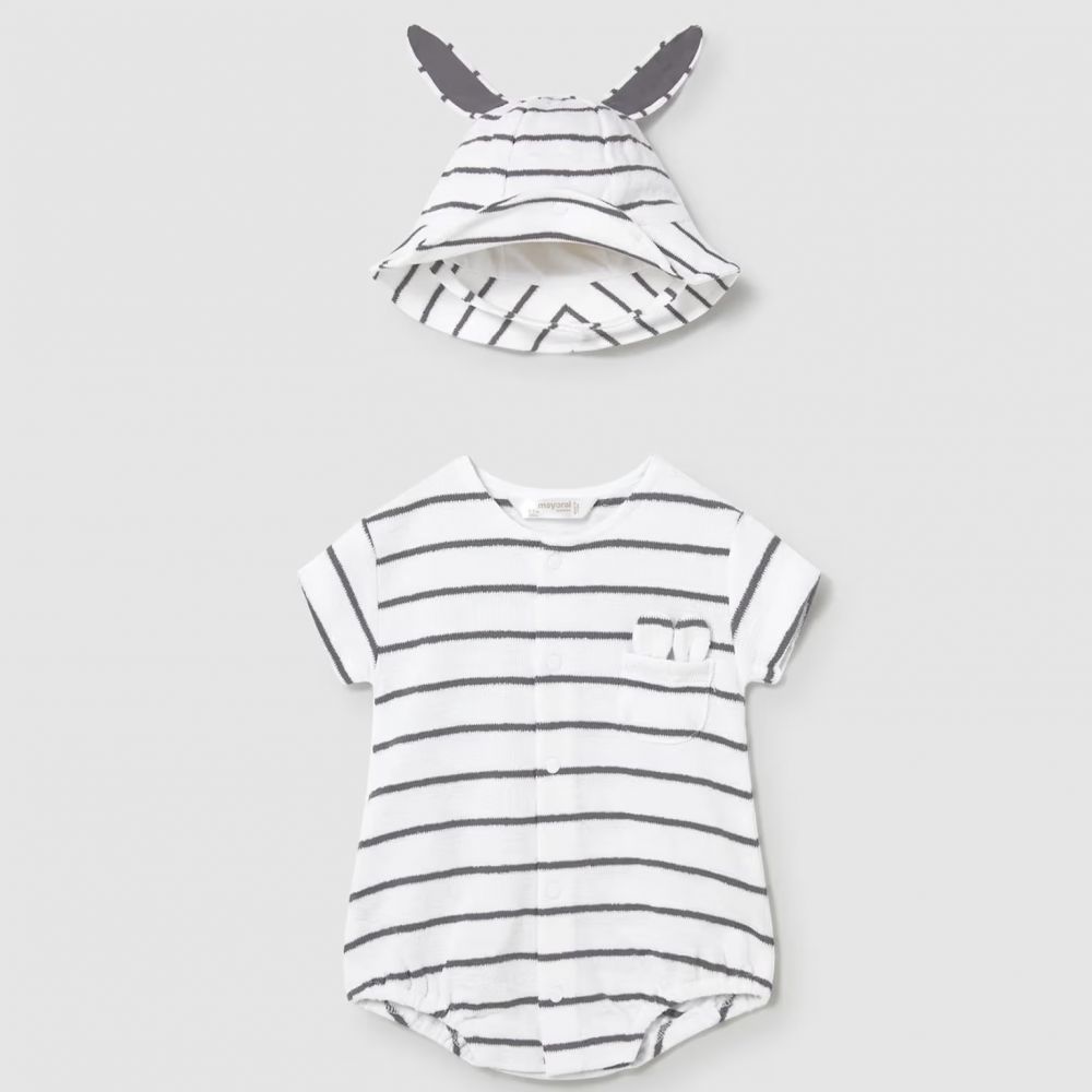 - Σετ με Καπέλο: Συνοδεύεται από ασορτί ριγέ καπέλο με τρισδιάστατα αυτάκια, που προστατεύει το κεφαλάκι του μωρού με τον πιο γλυκό τρόπο.