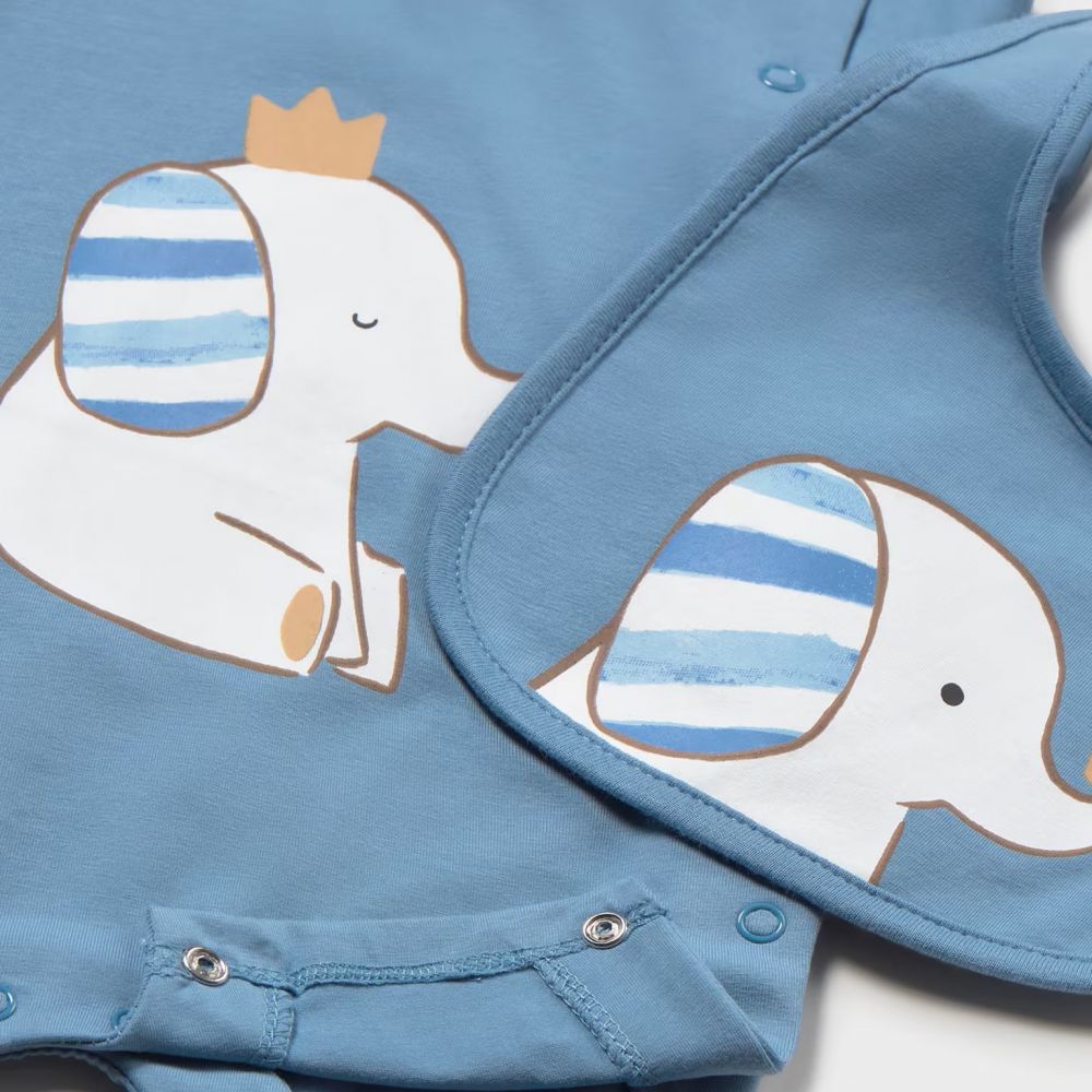 - Έξυπνος Σχεδιασμός: Περιλαμβάνει ασορτί σαλιάρα με κούμπωμα, διακοσμημένη με ένα γλυκό ελεφαντάκι που φοράει στέμμα.